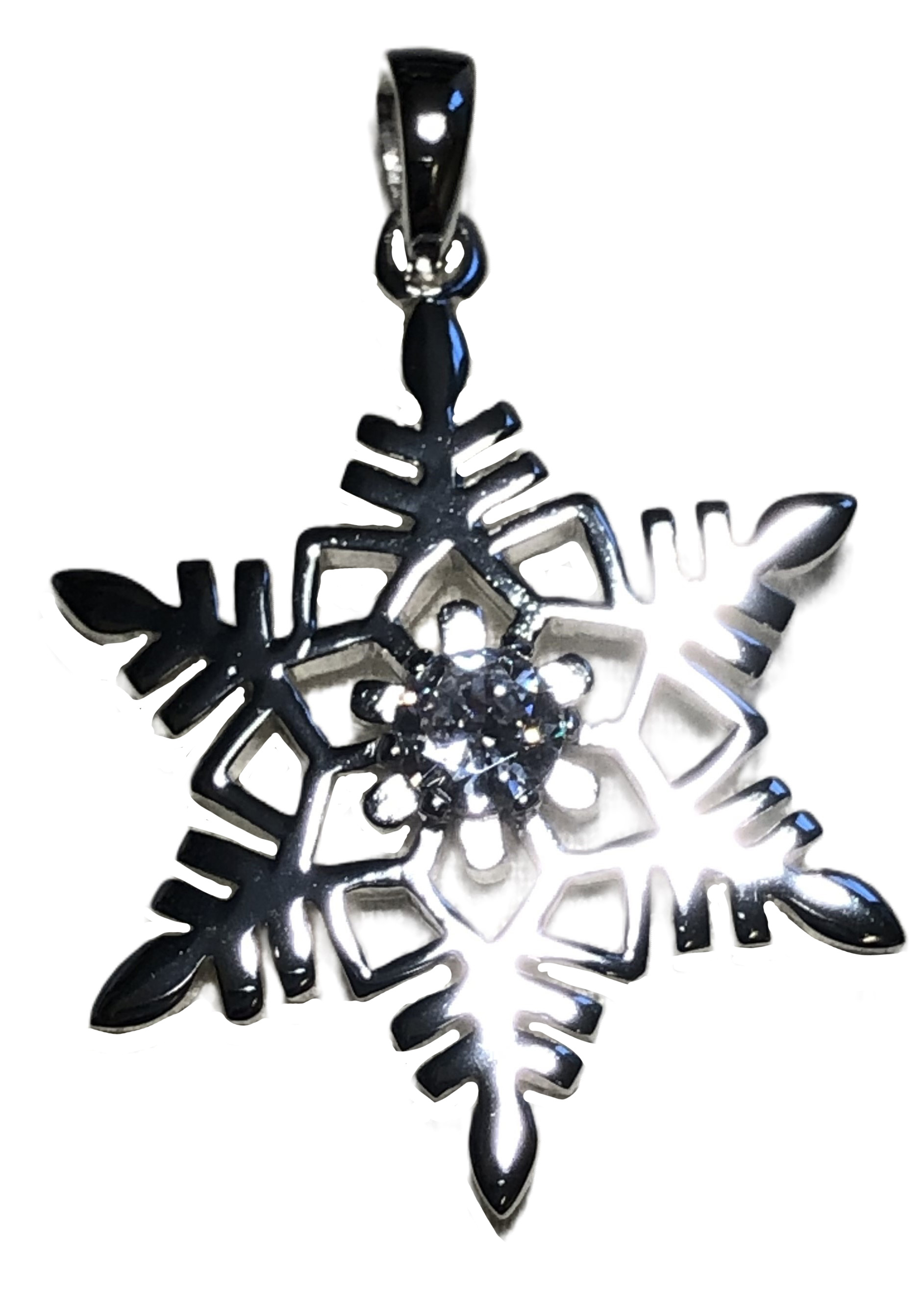 Bezaubernder Anhänger als Schneeflocke mit einem hellleuchtenden Zirkon als Mitte. Der Anhänger besteht aua 925 Silber und hat eine Größe von ca. 30 mm.